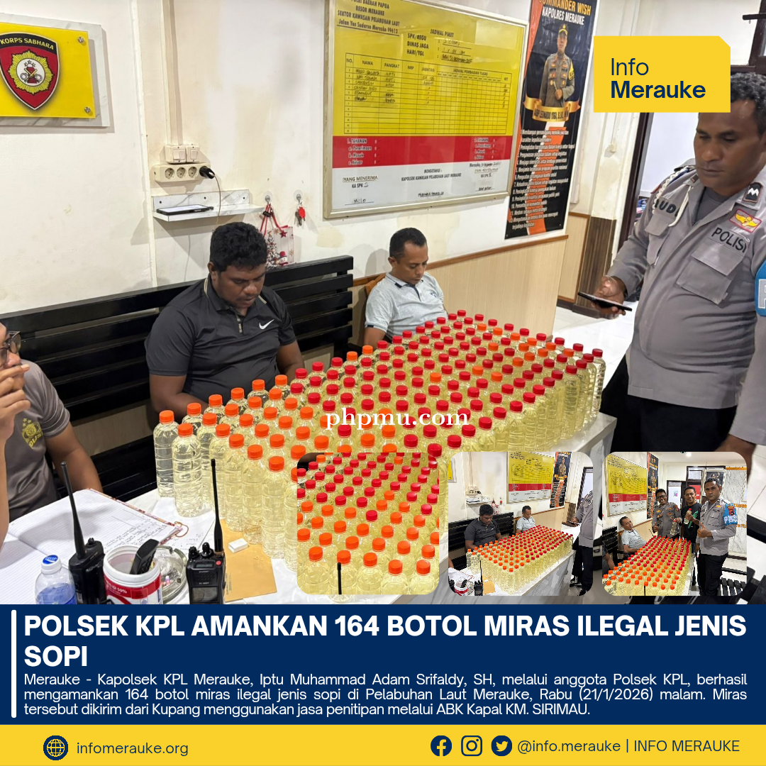 INFO MERAUKE - Kapolsek KPL Merauke, Iptu Muhammad Adam Srifaldy, SH, melalui anggota Polsek KPL, berhasil mengamankan 164 botol miras ilegal jenis sopi di Pelabuhan Laut Merauke, Rabu (21/1/2026) malam. Miras tersebut